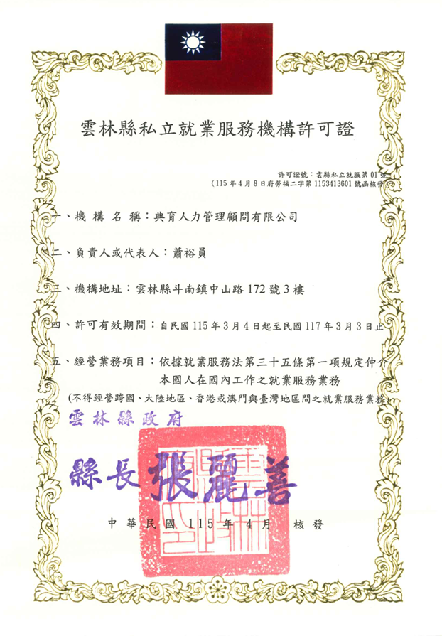 - 公司於民國112年度申請設立【私立就業服務機構證】